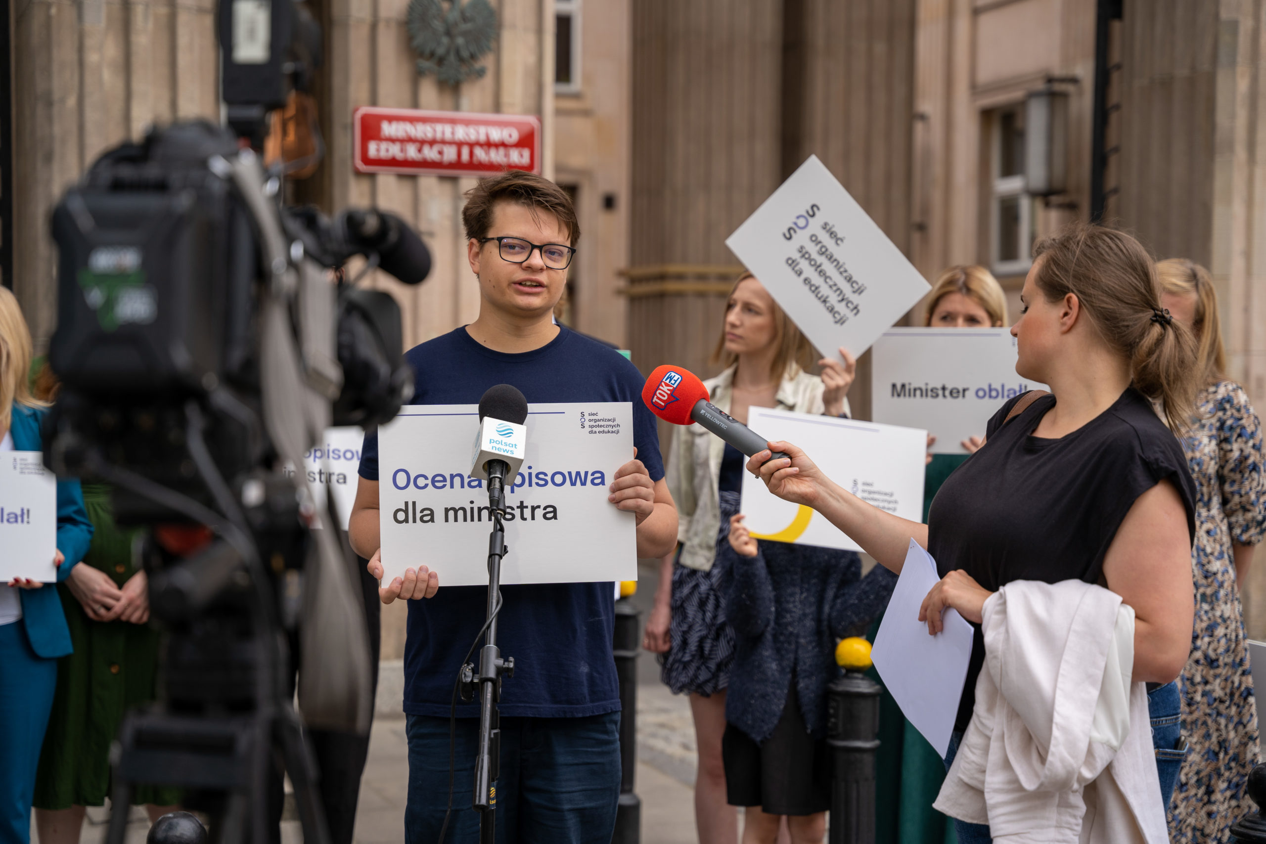 Jakub Kocjan z Akcji wziął udział w konferencji koalicji Wolna Szkoła pod Ministerstwem Edukacji z okazji zakończenia roku szkolnego.