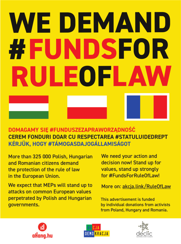 Wspólny apel do Parlamentu Europejskiego popierający mechanizm “fundusze za praworządność został opublikowany w POLITICO, jednym z najbardziej wpływowych tygodników zajmujących się sprawami europejskimi. To pierwszy tak mocny, wspólny głos od aktywistów i aktywistek trzech ruchów: Akcji Demokracji z Polski, aHang z Węgier i Declic z Rumunii.