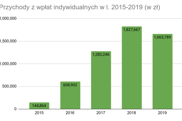 Większość naszych przychodów pochodzi od indywidualnych osób, którym bliskie są wartości takie jak: prawa człowieka, sprawiedliwość społeczna, ochrona klimatu i demokracja oraz państwo prawa. Z roku na rok zwiększamy udział wpłat indywidualnych w strukturze naszych przychodów. Średnia wpłata, którą otrzymujemy wynosi 35 złotych.