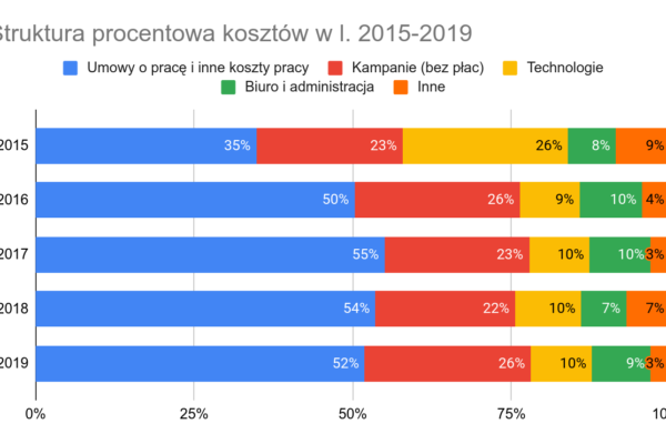 Nasze wydatki utrzymujemy na niskim poziomie. Pieniądze, które otrzymujemy wydajemy na: płace kilkunastoosobowego zespołu, niewielkie koszty biurowe, utrzymanie infrastruktury technologicznej potrzebnej do prowadzenia akcji oraz na działania związane z prowadzeniem kampanii.