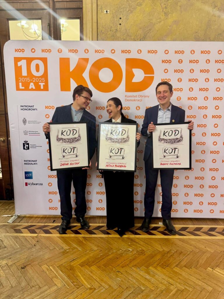 10 wspaniałych, strasznych i pięknych lat. Wczoraj w Sali im. Starzyńskiego PKiN świętowaliśmy urodziny Komitetu Obrony Demokracji! Sprawdzonych w boju przyjaciół, przyjaciółek, ale też, jak powiedział Jakub Kocjan w swoim wystąpieniu, dziękując za wyróżnienie jego wraz z Bogumiłem Kolmasiakiem Nagrodą “Przyjaciela Demokracji”, starszych braci (i sióstr!) w wierze – czasem naiwnej, ale zawsze gorącej i szczerej. W wierze, że demokracja jednak może wygrać, oszukać wszelkie prawidła społeczne i uciec spod topora.