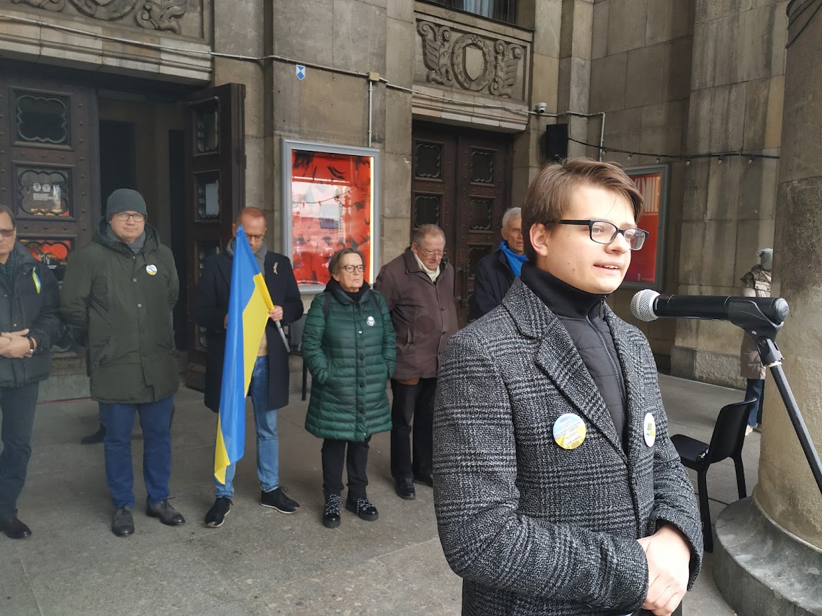“Wiele stałych prawd zostało dzisiaj podważonych – pacyfiści zbierają pieniądze na broń i kamizelki kuloodporne… Cała Warszawa pomaga. Tym bardziej chcemy dziś zaapelować – obecność w UE nie powinna być okupiona krwią, ale jeśli tak – to żaden inny naród nie zasłużył na nią tak bardzo jak Ukraina, która już dwukrotnie na Majdanie opowiedziała się za demokracją i od dawna walczy o nią na wojnie z Rosją” [1].