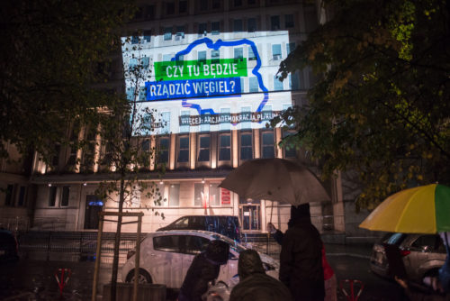 Na Ministerstwie Energii aktywiści wyświetlili pytanie „Czy tu będzie rządzić węgiel?”. – Decyzje dotychczasowych rządów spowodowały, że nasza energetyka nadal opiera się na przestarzałych paliwach kopalnych – węglu, wstrzymywany jest rozwój OZE, a na arenie międzynarodowej rząd polski blokuje ambitne, europejskie polityki klimatyczne. – dodaje Paszewska.